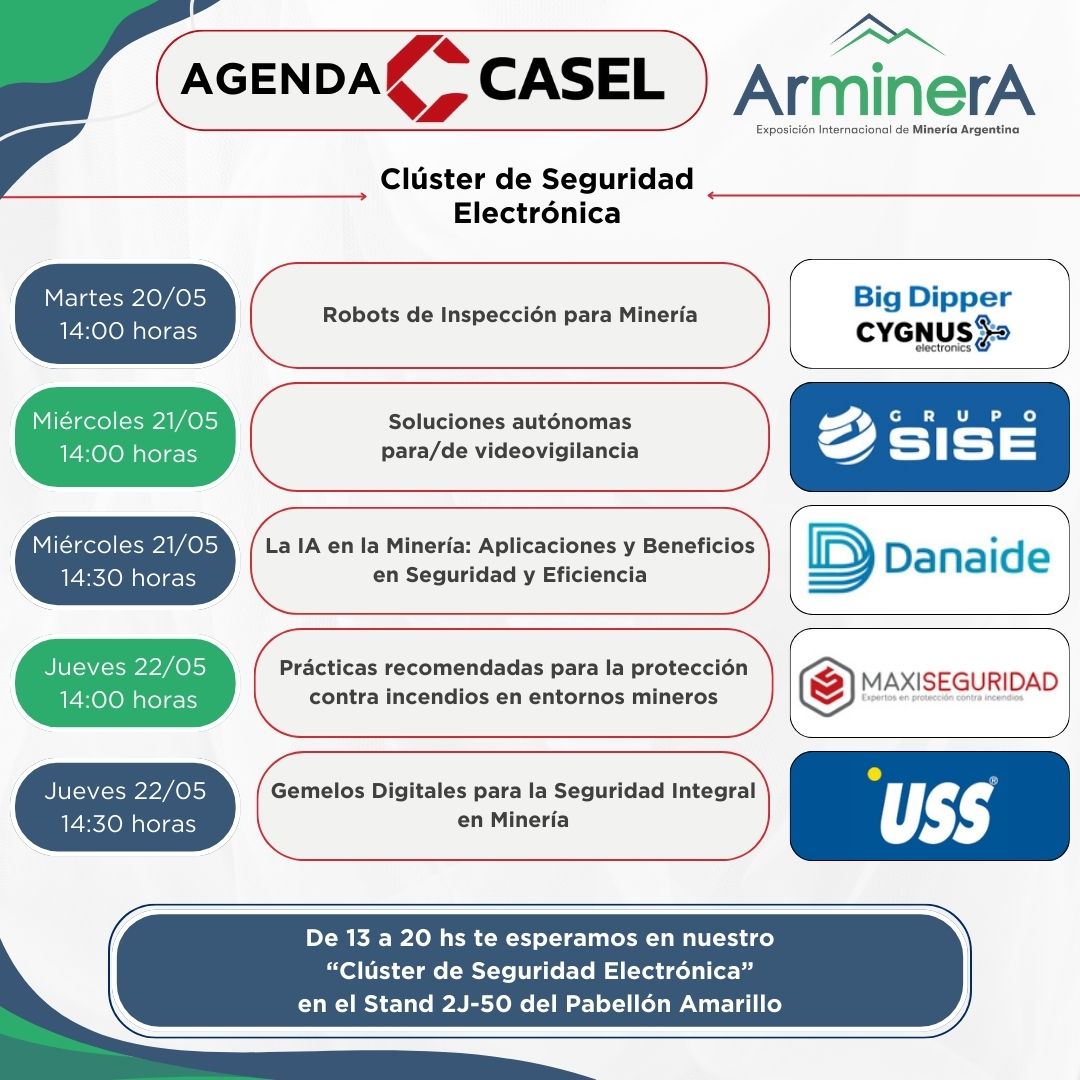 - Finalmente, el jueves 22 de mayo, a las 14:00 h, Maxiseguridad brindará la charla “Prácticas recomendadas para la protección contra incendios en entornos mineros”, seguida por USS, que a las 14:30 h disertará sobre «Gemelos Digitales para la Seguridad Integral en Minería».